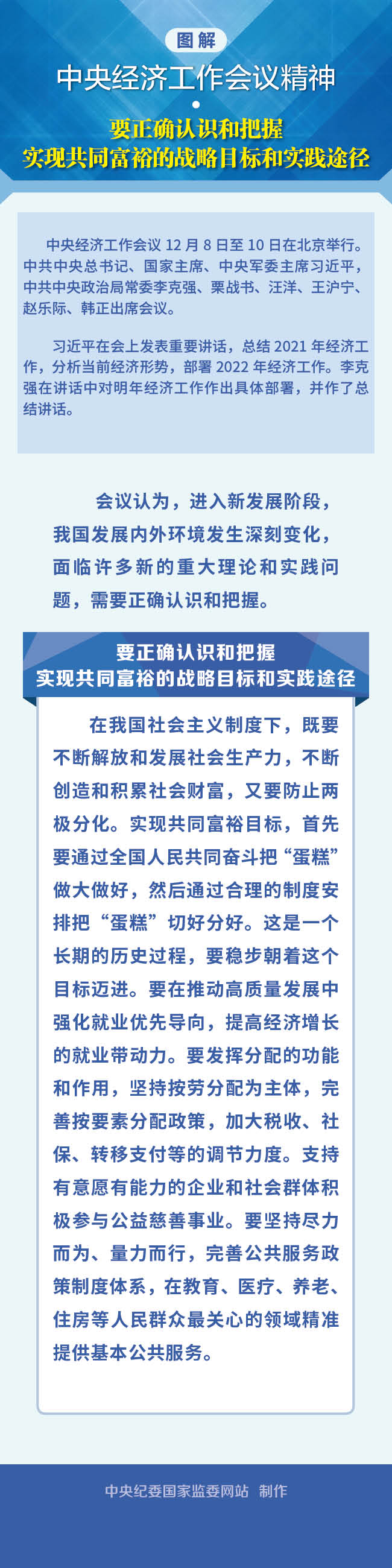 中央經濟工作會議要求正確認識和把握實現共同富裕的戰略目標和實踐途徑。會議指出,實現共同富裕目標,首先要通過全國人民共同奮斗把“蛋糕”做大做好,然后通過合理的制度安排把“蛋糕”切好分好。這是一個長期的歷史過程,要穩步朝著這個目標邁進。會議部署,要在推動高質量發展中強化就業優先導向,提高經濟增長的就業帶動力。要發揮分配的功能和作用,堅持按勞分配為主體,完善按要素分配政策,加大稅收、社保、轉移支付等的調節力度。支持有意愿有能力的企業和社會群體積極參與公益慈善事業。要堅持盡力而為、量力而行,完善公共服務政策制度體系,在教育、醫療、養老、住房等人民群眾最關心的領域精準提供基本公共服務。