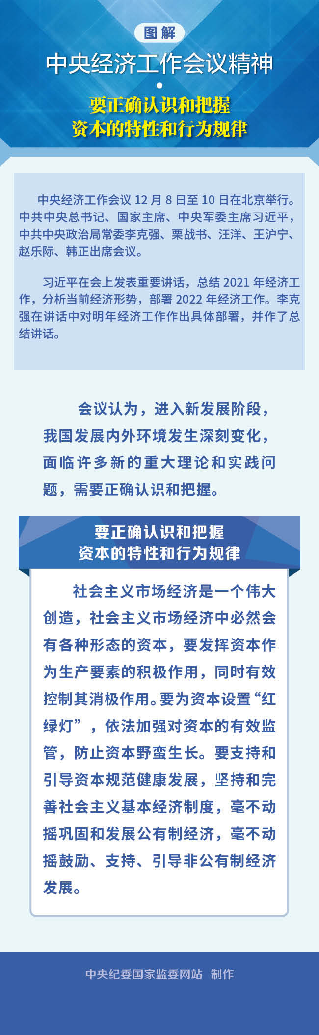 中央經濟工作會議強調,要為資本設置“紅綠燈”,依法加強對資本的有效監管,防止資本野蠻生長。要支持和引導資本規范健康發展,堅持和完善社會主義基本經濟制度,毫不動搖鞏固和發展公有制經濟,毫不動搖鼓勵、支持、引導非公有制經濟發展。