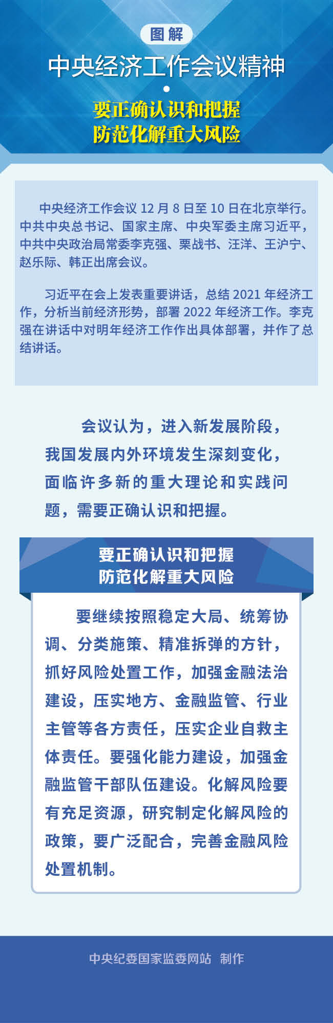 圍繞正確認識和把握防范化解重大風險,中央經濟工作會議強調,要繼續按照穩定大局、統籌協調、分類施策、精準拆彈的方針,抓好風險處置工作,加強金融法治建設,壓實地方、金融監管、行業主管等各方責任,壓實企業自救主體責任。要強化能力建設,加強金融監管干部隊伍建設。化解風險要有充足資源,研究制定化解風險的政策,要廣泛配合,完善金融風險處置機制。