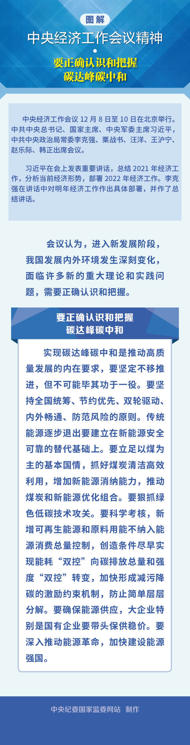 “實現碳達峰碳中和是推動高質量發展的內在要求,要堅定不移推進,但不可能畢其功于一役。”中央經濟工作會議強調,要堅持全國統籌、節約優先、雙輪驅動、內外暢通、防范風險的原則。傳統能源逐步退出要建立在新能源安全可靠的替代基礎上。要立足以煤為主的基本國情,抓好煤炭清潔高效利用,增加新能源消納能力,推動煤炭和新能源優化組合。要狠抓綠色低碳技術攻關。要科學考核,新增可再生能源和原料用能不納入能源消費總量控制,創造條件盡早實現能耗“雙控”向碳排放總量和強度“雙控”轉變,加快形成減污降碳的激勵約束機制,防止簡單層層分解。要確保能源供應,大企業特別是國有企業要帶頭保供穩價。要深入推動能源革命,加快建設能源強國。