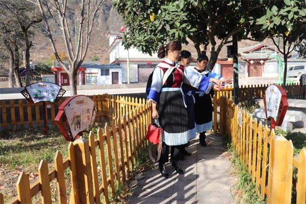 在黃山鎮長水社區廉潔文化和警示教育點,身著納西族服飾的婦女走過穿插著廉潔花草牌的小路。