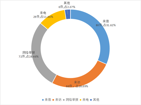 從舉報方式來看,來信80件,占31.62%;來訪66件,占26.09%;網絡舉報72件,占28.46%;來電29件,占11.46%;其他6件,占2.37%。