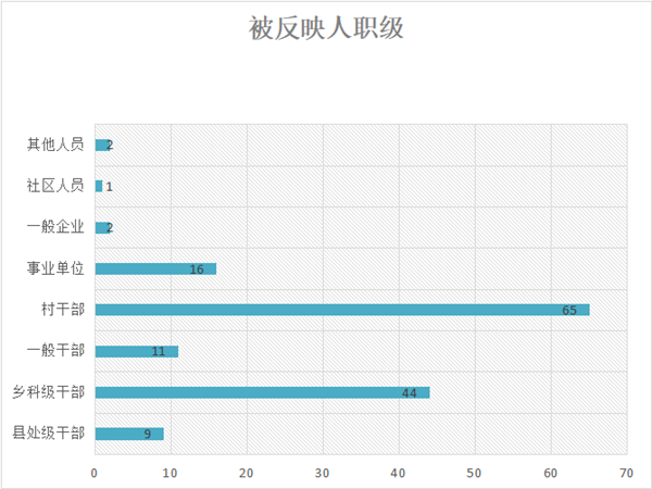 從被反映人職級來看,在受理的檢舉控告類舉報中,涉及縣處級干部9件,占比6%;涉及鄉科級干部44件,占比29.33%;涉及一般干部11件,占比7.33%;涉及村干部65件,占比43.33%;涉及事業單位人員16件,占比10.67%;涉及一般企業人員2件,占比1.33%;涉及社區人員1件,占比0.68%;涉及其他人員2件,占比1.33%。