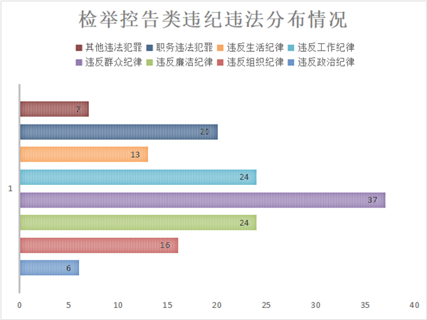 從初次檢舉控告類違紀違法行為來看,違反政治紀律行為6件,違反組織紀律行為16件,違反廉潔紀律行為24件,違反群眾紀律行為37件,違反工作紀律行為24件,違反生活紀律行為13件,職務違法犯罪行為20件,其他違法犯罪行為7件。