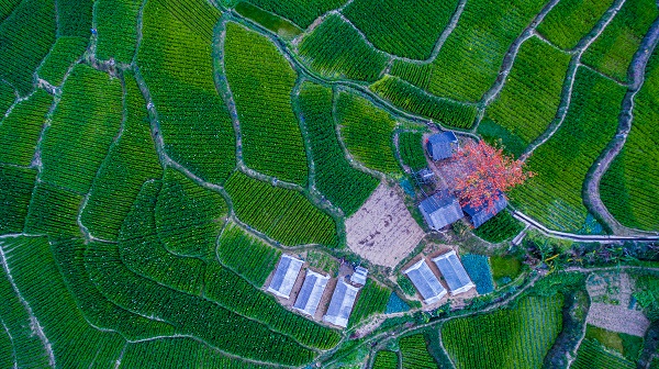 雨水前后,怒江畔的香料煙滋滋生長,猶如綠色的地毯鋪在田野上,火紅的木棉花和白色房子,在綠波中閃光,大地的色彩開始斑斕起來。(朱昌維 攝)