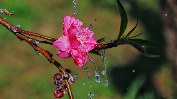 盛放的桃花,仰著臉龐,渴望著雨水的滋潤。雨水過后,羞紅臉的桃花更顯嬌艷。(王升瓊 攝)