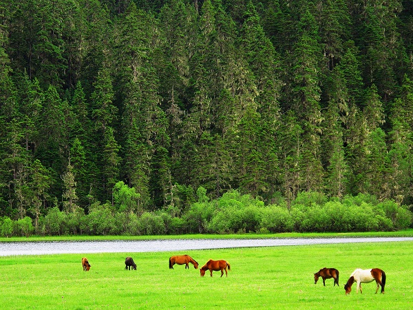 春雨絲絲,草木滋滋。一場春雨,青了樹梢,綠了小草,三五成群的馬兒徜徉在河畔草地,盡情享受春的美食。(謝大才 攝)