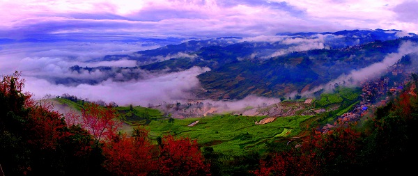 雨水到來天地歡,萬物煥發新容顏。雨水滋潤著梯田,山野萬物復蘇,清新空曠。(楊增輝 攝)