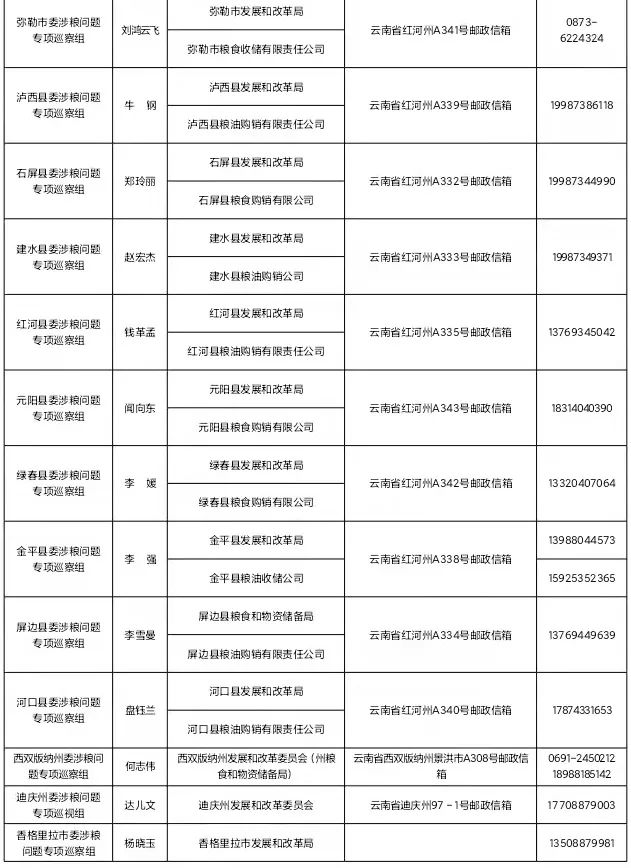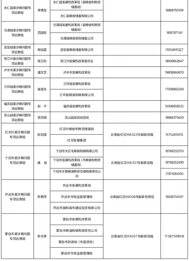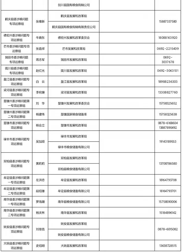 根據省委決策部署和省委巡視工作領導小組具體安排,省委涉糧問題專項巡視組分別對省糧食和物資儲備局黨組、云南農墾集團黨委開展涉糧問題專項巡視,并重點了解省發展和改革委員會、省財政廳、省市場監督管理局和云天化集團有限責任公司等單位黨組織的涉糧工作落實情況。各州(市)委涉糧問題專項巡察組同步組織對本地區涉糧重點單位開展涉糧問題專項巡察,并重點了解涉糧有關單位的涉糧工作落實情況;同時,16個州(市)黨委結合本地區實際,統籌市縣兩級巡察力量,采取統合巡察、交叉巡察、提級巡察、點穴式巡察等方式,堅持以上看下與以下看上相結合,負責了解縣(市、區)黨委、政府落實屬地管理主體責任情況。