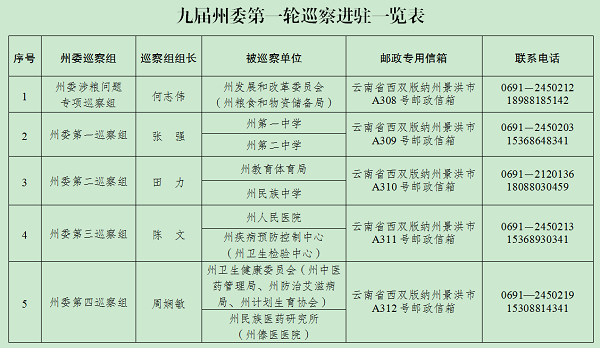 截至11月9日,西雙版納州委5個巡察組完成對9個州直部門(單位)的進駐,九屆州委第一輪巡察全面展開。