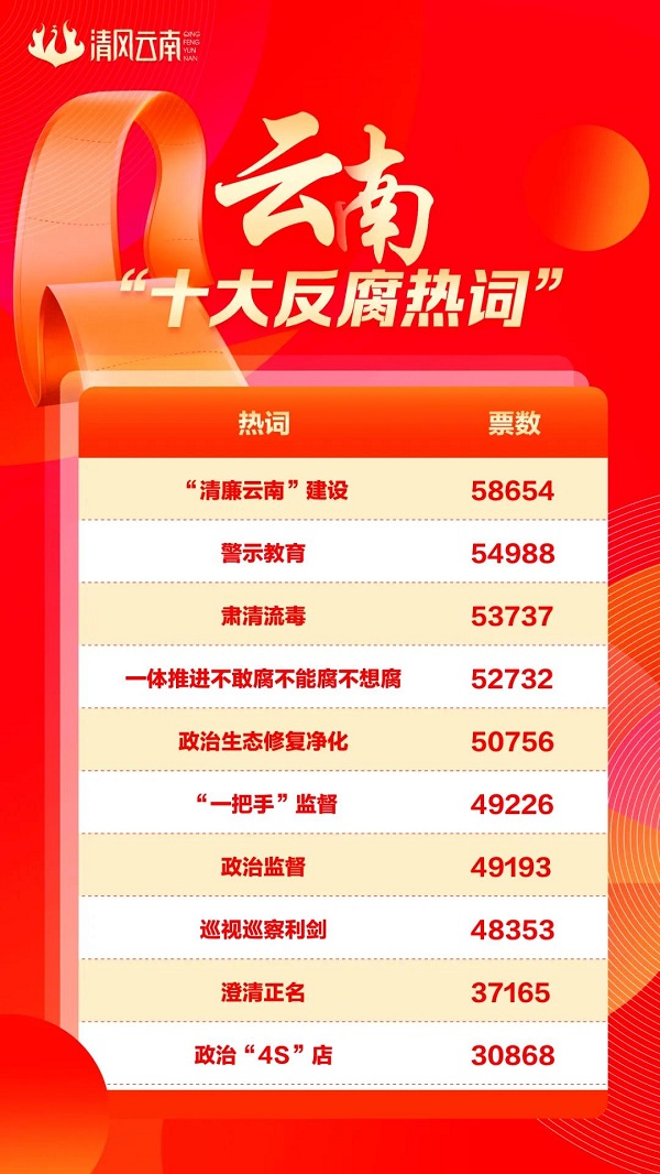 為把握人民群眾對反腐工作的期待,營造正風肅紀反腐良好氛圍,云南省紀委省監委開門問策、匯眾智、納民意,于10月18日至10月31日開展了歷時兩周的云南“十大反腐熱詞”網絡評選投票活動。