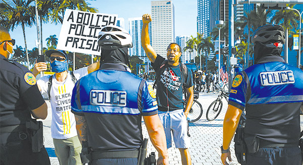 圖為美國白人至上組織“驕傲男孩”成員與“黑人的命也是命”支持者在紀念弗洛伊德去世一周年的活動上發生爭執。 (圖片來源:人民視覺)