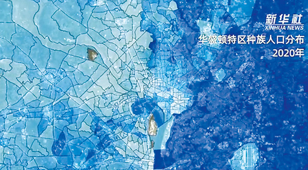 圖為經過處理的華盛頓特區種族人口分布衛星圖像(2020年)。 (圖片來源:新華網《衛星調查:美國城市陷入分裂》)