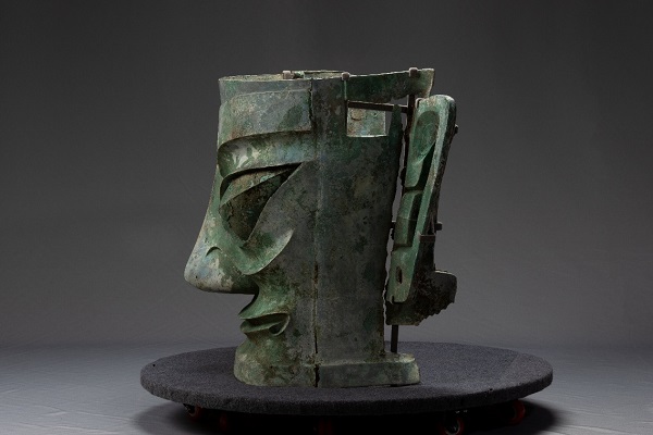 青銅大面具寬131厘米、高71厘米、深66厘米,重131斤,是目前已知三星堆遺址出土的體量最大、保存狀況完好的大型青銅面具。其寬頤廣額、棱角分明,眉部、眼睛、嘴唇等線條流暢、皆突出于面部,粗長眉作揚起狀,面具的兩側上下及額部正中有方形穿孔,可能是用于固定用途。青銅大面具是三星堆文化典型器物,距今已有3000多年,體現了古蜀先民對自然萬物與人神世界的理解與思考。