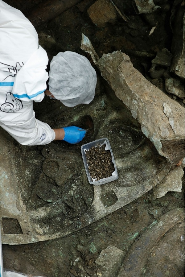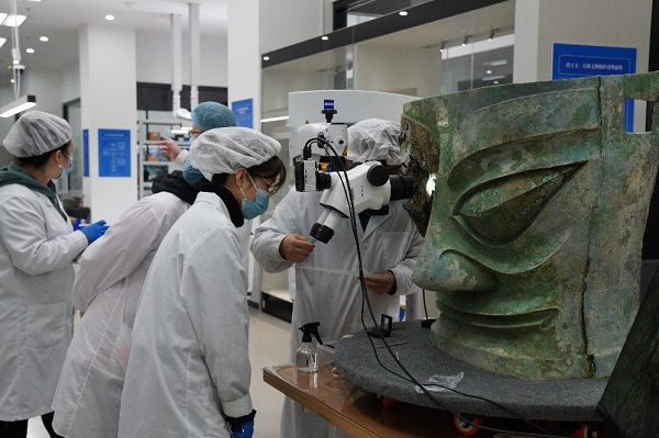 2021年6月23日,面具提取出坑。考古和文物保護人員對青銅大面具的鑄造工藝進行分析研究后認為,其制作先分鑄成型,由面部、臉頰后部、眼睛、耳朵等多部位分別鑄造,再組合成一體,大面具右側眼部還發現有經緯組織的絲綢織物殘留。