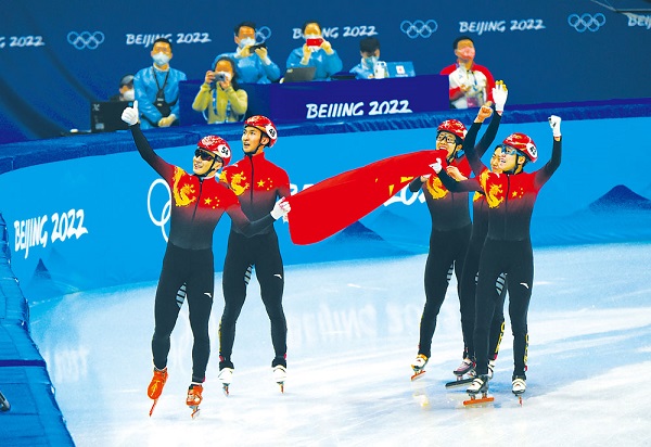 短道速滑混合團體接力比賽結束后,中國隊選手舉國旗繞場致謝。 瞿芃 攝
