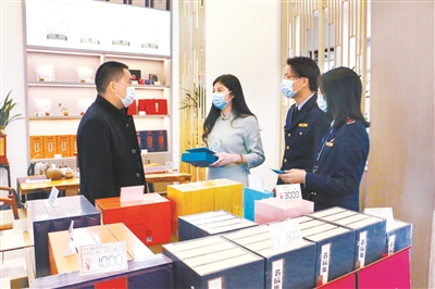 福建省福清市紀委監委把整治領導干部利用名貴特產類特殊資源謀取私利問題作為正風肅紀、反對“四風”的整治重點,聯合相關職能部門深入名貴特產經營場所進行檢查,深化整治違規吃喝送禮歪風。圖為該市紀委監委干部在當地一家茶葉店了解相關情況。 高晶晶 攝