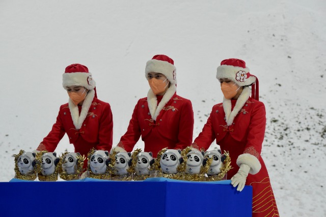 頒獎儀式上,工作人員為獲獎運動員準備紀念版“冰墩墩”。 瞿芃 攝