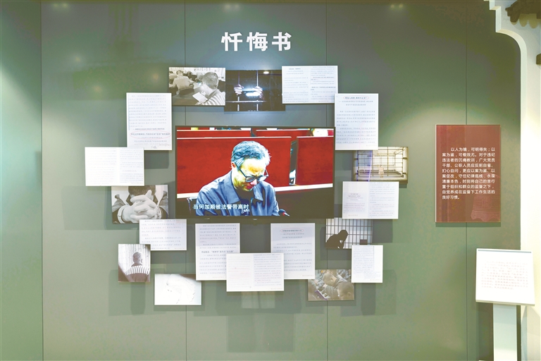 圖為浙江省嘉善縣警示教育基地“以案為鑒,警鐘長鳴”板塊中的“懺悔墻”場景,墻上展示的是近年來查處的部分黨員干部的懺悔書。 周悅怡 攝