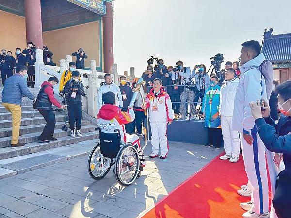 在天壇公園參加完接力活動后,陳建新將直奔冬殘奧村,繼續備戰輪椅冰壺項目。這位1992年出生的小伙子,18歲時因一場交通意外導致雙腿高位截癱。“剛因車禍致殘后,我不愿意接觸社會,封閉了自己,是體育給了我新的希望,讓我的生命又有了溫度。”陳建新沒有向命運屈服,而是選擇練習冰壺,憑借驚人的毅力和頑強的意志進入國家隊,最終奪得奧運冠軍。