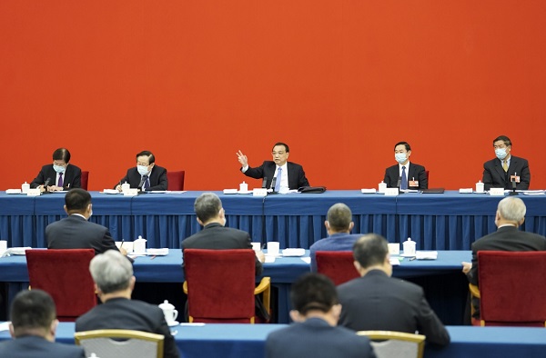 3月6日,中共中央政治局常委、國務院總理李克強看望出席全國政協十三屆五次會議的經濟界委員并參加討論。新華社記者 殷博古 攝