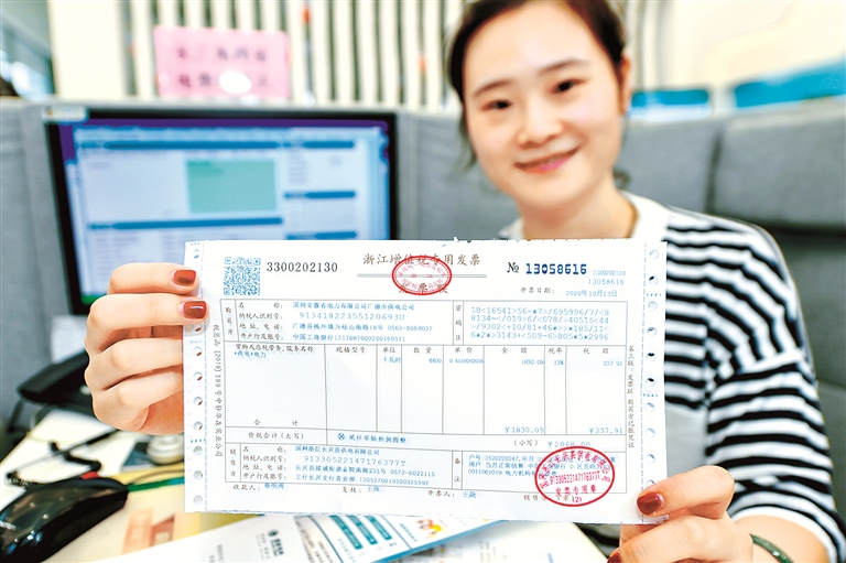 浙江省湖州市長興供電營業廳,工作人員正在展示剛剛辦理的來自安徽廣德的電費增值稅專用發票。(圖片來源:視覺中國)