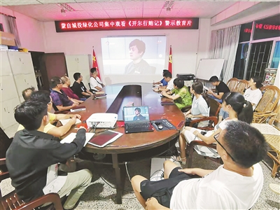 云南省紀委監委對昆明開爾科技有限公司為謀取非法利益、以巨額款項行賄“圍獵”領導干部的典型案例進行深入剖析,拍攝警示教育片《開爾行賄記》。圖為蒙自市城投綠化公司組織員工集中觀看《開爾行賄記》。王敏佳 攝