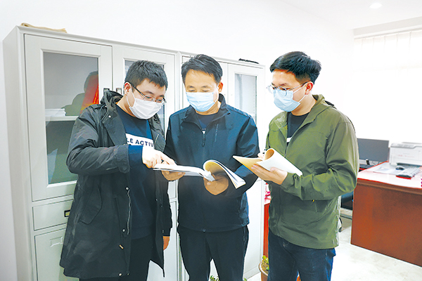 遼寧省盤錦市紀(jì)委監(jiān)委第七紀(jì)檢監(jiān)察室四級主任科員馬寶華(中)和同事討論分析案情。 徐騰 攝