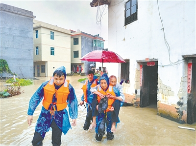 暴雨中,湖南省汝城縣馬橋鎮紀委干部將受困群眾從危房中轉移到集中安置點。曹化祥 攝