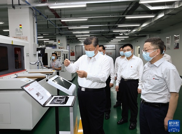 6月28日,中共中央總書記、國家主席、中央軍委主席習(xí)近平在湖北省武漢市考察。這是28日下午,習(xí)近平在武漢華工激光工程有限責(zé)任公司半導(dǎo)體面板激光智能裝備生產(chǎn)車間,察看激光技術(shù)產(chǎn)業(yè)應(yīng)用展品。新華社記者 鞠鵬 攝