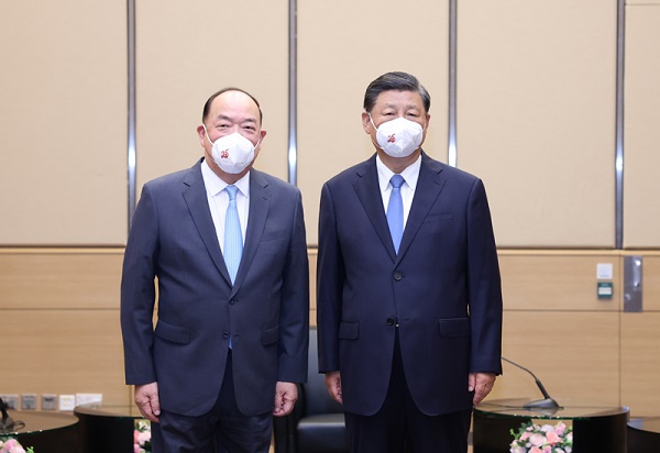 6月30日下午,國(guó)家主席習(xí)近平在香港會(huì)見(jiàn)前來(lái)出席慶祝香港回歸祖國(guó)25周年活動(dòng)的澳門特別行政區(qū)行政長(zhǎng)官賀一誠(chéng)。新華社記者 劉彬 攝