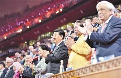 2019年5月15日晚,國家主席習近平和夫人彭麗媛在北京國家體育場同出席亞洲文明對話大會的外方領導人夫婦共同出席亞洲文化嘉年華活動。新華社記者 殷博古 攝