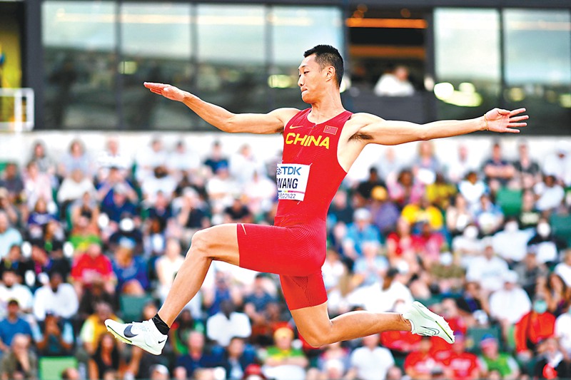 7月17日,在美國俄勒岡州尤金市舉行的2022世界田徑錦標賽男子跳遠決賽中,中國選手王嘉男以8米36的成績奪得冠軍。圖為當日,王嘉男在男子跳遠決賽中。(圖片來源:視覺中國)
