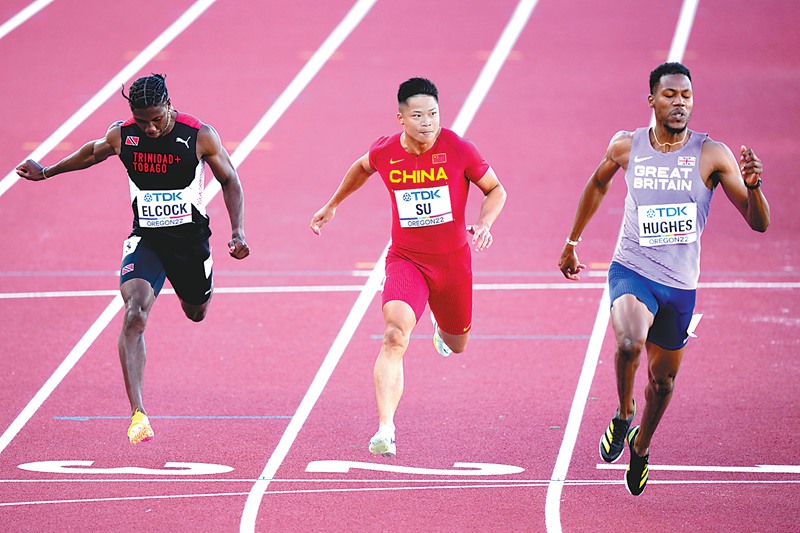 7月16日,中國選手蘇炳添(中)在男子100米預賽中。最終,蘇炳添晉級半決賽。圖為當日,2022世界田徑錦標賽男子100米預賽在美國俄勒岡州尤金市舉行。 新華社記者 王迎 攝