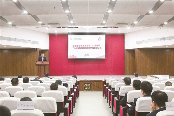 林傳偉案發生后,中國銀行福建省分行堅持用“案中人”教育“身邊人”,集中開展警示教育。圖為該行警示教育大會現場。(駐中國銀行紀檢監察組供圖)