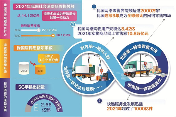 體現我國消費市場十年間變化的還有消費結構的持續升級和新型消費的蓬勃發展:2021年我國居民恩格爾系數比2012年下降了3.2個百分點;新車銷售量連續13年居全球首位;5G手機出貨量2.66億部,占手機出貨總量的76%。