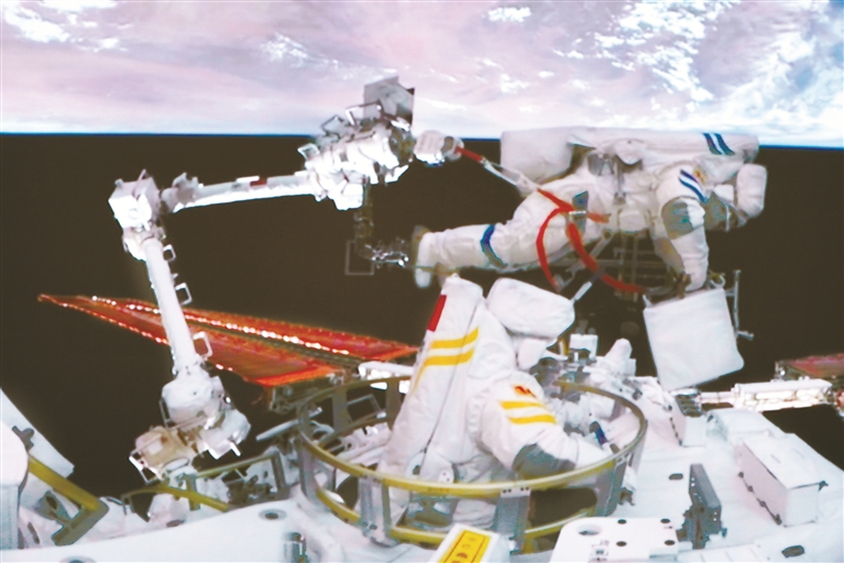 9月1日18時(shí)26分,我國航天員首次從問天實(shí)驗(yàn)艙氣閘艙出艙實(shí)施艙外活動(dòng)。新華社發(fā)(李杰 攝)