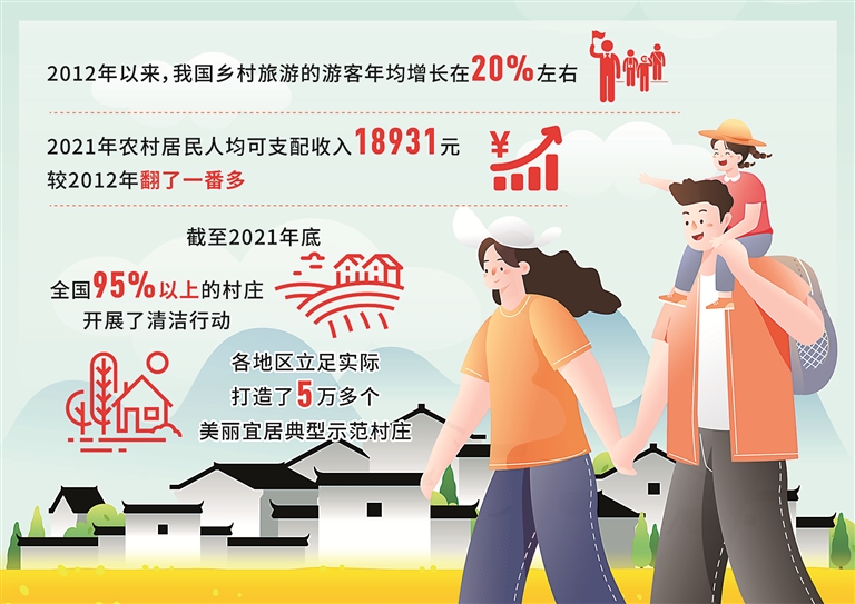 數據顯示,2012年以來,我國鄉村旅游的游客年均增長在20%左右。2021年農村居民人均可支配收入18931元,較2012年翻了一番多,農民生產生活水平上了一個大臺階。越來越多的鄉村通過旅游業的發展變成了“美麗鄉村”“幸福鄉村”。
