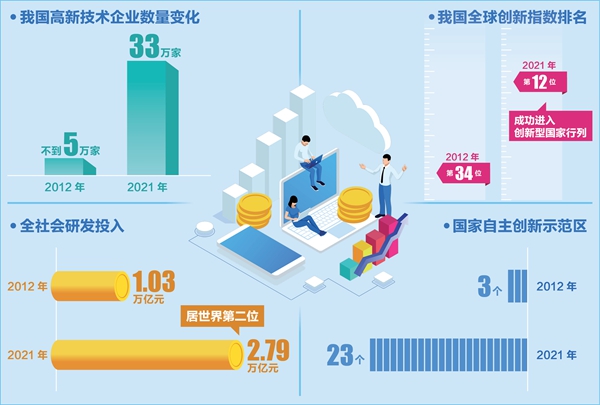 十年前,我國高新技術企業不到5萬家,如今達到33萬家。在全球企業研發投入2500強榜單上,我國企業從2013年首次發布時的180家增長到2021年的683家。
