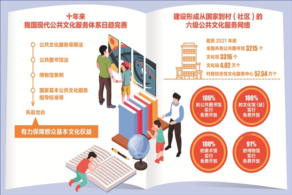 十年來,我國現(xiàn)代公共文化服務體系日趨完善,公共文化服務保障法、公共圖書館法、博物館條例以及國家基本公共文化服務指導標準等先后出臺,有力保障群眾基本文化權益。建設形成從國家到村(社區(qū))的六級公共文化服務網(wǎng)絡,截至2021年底,全國共有公共圖書館3215個、文化館3316個、文化站4.02萬個、村級綜合性文化服務中心57.54萬個。所有公共圖書館、文化館(站)、美術館和91%的博物館實行免費開放。