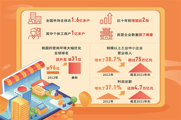 以“放管服”改革為抓手,我國(guó)促進(jìn)中小企業(yè)發(fā)展的制度和機(jī)制不斷完善,營(yíng)商環(huán)境顯著改善,中小企業(yè)綜合實(shí)力、核心競(jìng)爭(zhēng)力不斷增強(qiáng)。截至2021年末,全國(guó)企業(yè)的數(shù)量達(dá)到4842萬(wàn)戶,其中99%以上都是中小企業(yè)。規(guī)模以上工業(yè)中小企業(yè)營(yíng)業(yè)收入超過(guò)75萬(wàn)億元,利潤(rùn)總額達(dá)到4.7萬(wàn)億元,較2012年分別增長(zhǎng)了38.7%和37.1%。我國(guó)的營(yíng)商環(huán)境大幅優(yōu)化,全球排名從2013年的第96位躍升至最新的第31位。