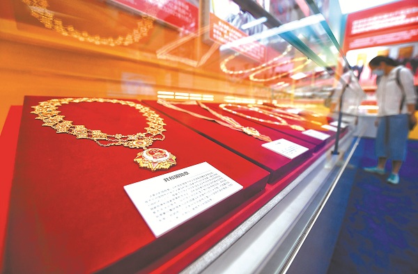 圖為“奮進(jìn)新時(shí)代”主題成就展上展出的共和國(guó)勛章。(圖片來(lái)源:視覺(jué)中國(guó))