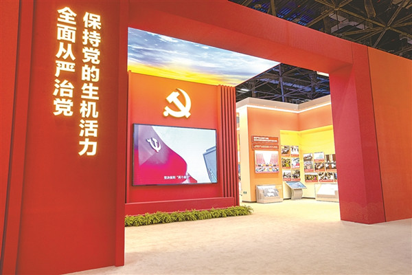 9月27日,“奮進(jìn)新時代”主題成就展在北京展覽館正式開幕。圖為“全面從嚴(yán)治黨 保持黨的生機(jī)活力”展區(qū)。(圖片來源:視覺中國)