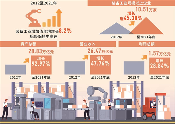 2012至2021年,我國(guó)裝備工業(yè)增加值年均增長(zhǎng)8.2%,始終保持中高速;今年以來(lái),更是克服疫情影響率先回升,拉動(dòng)制造業(yè)較快恢復(fù)。截至2021年底,裝備工業(yè)規(guī)模以上企業(yè)達(dá)10.51萬(wàn)家,比2012年增長(zhǎng)近45.30%;資產(chǎn)總額、營(yíng)業(yè)收入、利潤(rùn)總額分別達(dá)到28.83萬(wàn)億元、26.47萬(wàn)億元和1.57萬(wàn)億元,比2012年增長(zhǎng)92.97%、47.76%、28.84%。
