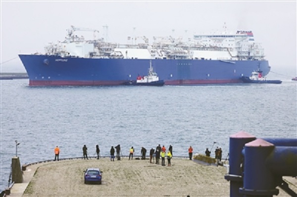 為使用液化天然氣以替代俄羅斯管道運輸天然氣,德國政府今年將租用4艘特種船作為液化天然氣儲存及再氣化裝置。圖為當地時間11月23日,首艘液化天然氣特種船“海王星”號抵達德國呂根島。(圖片來源:視覺中國)