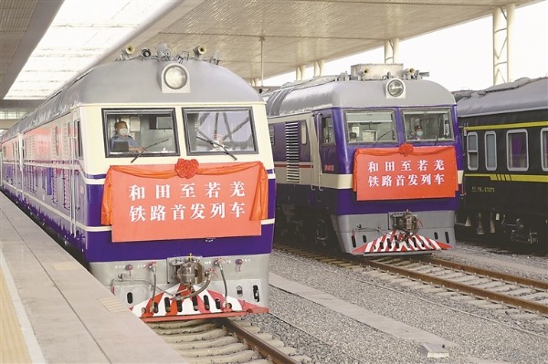 6月16日,和田至若羌鐵路開通運營,新疆鐵路網得到進一步完善,形成了世界首個沙漠鐵路環線——長達2712公里的環塔克拉瑪干沙漠鐵路環線。和若鐵路的建成通車,將有力促進西部邊疆鐵路網建設,極大便利沿線各族人民群眾出行和貨物運輸,帶動沿線資源開發,鞏固邊疆國防,助力鄉村振興,具有十分重要的意義。