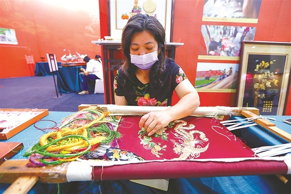 圖為與會人員在博覽會現場進行粵繡展演。(圖片來源:視覺中國)