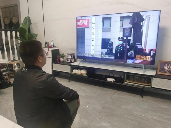鎮康縣紀委監委紀檢監察干部在家里通過電視觀看電視專題片《零容忍》。(李曉雁 攝)