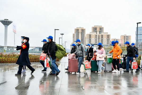 2月8日,600余名務工人員免費乘坐高鐵,從貴州遵義站前往廣東省返崗務工。這是貴州省今年開行的首趟返崗務工動車專列。 新華社記者 楊文斌 攝