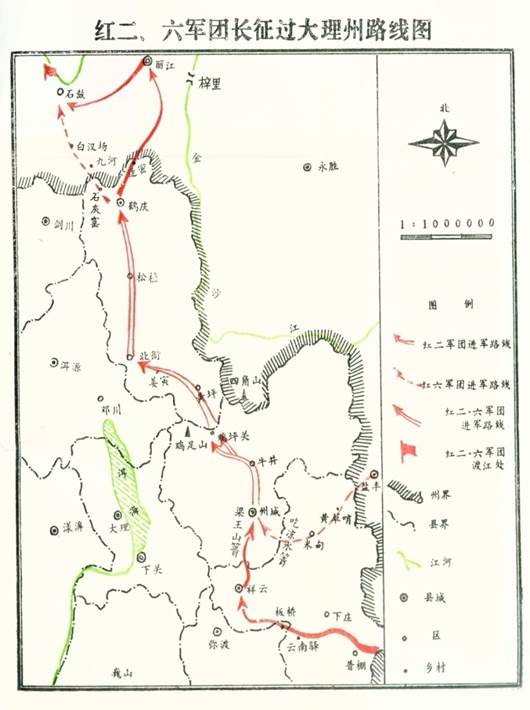 圖為紅二、六軍團(tuán)長(zhǎng)征過大理的線路圖。